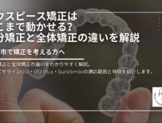 マウスピース矯正はどこまで動かせる?部分矯正と全体矯正の違いを解説 矯正治療には「部分矯正」と「全体矯正」がある 矯正治療には、大きく分けて「部分矯正」と「全体矯正」の2つの方法があります。 どちらも歯並びを...